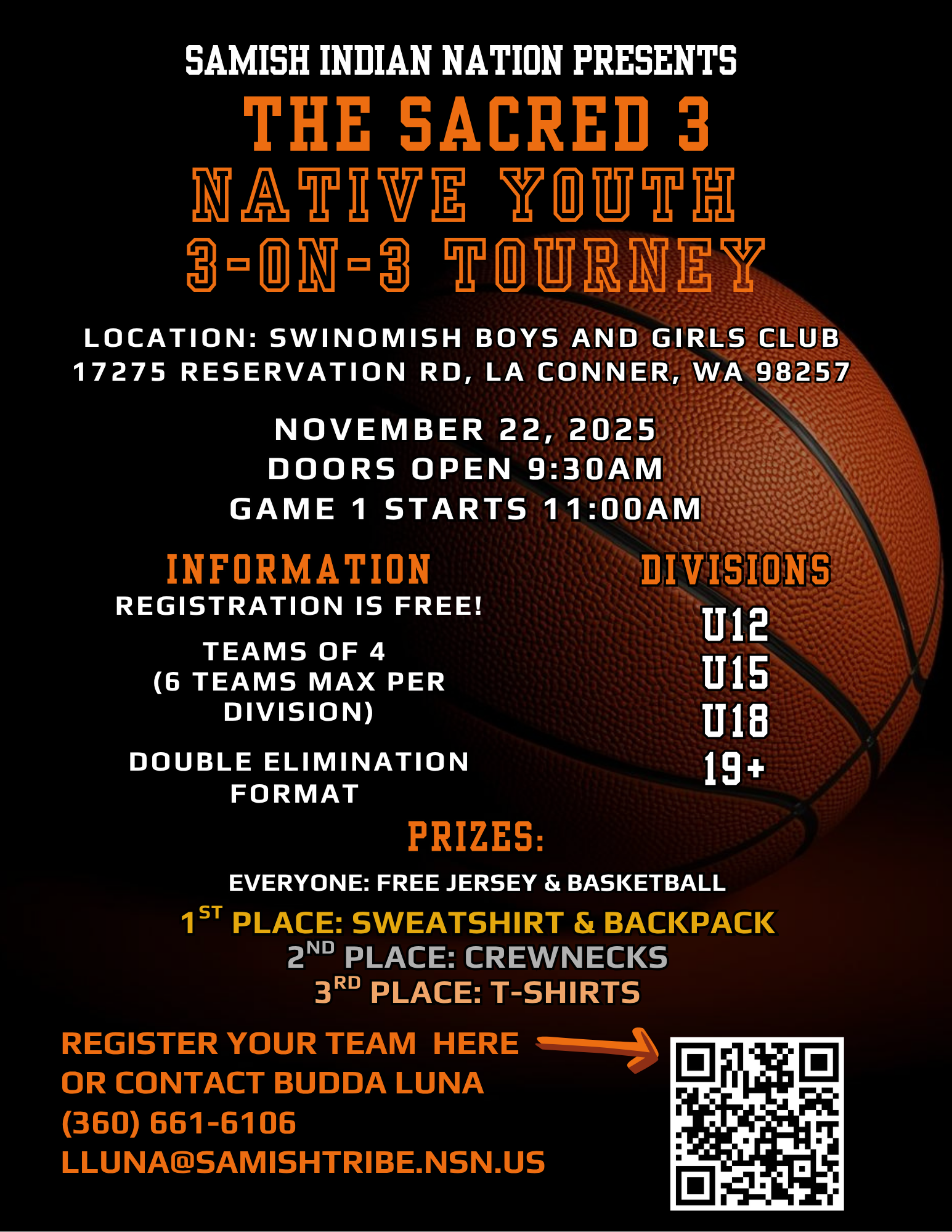 Join us for The Sacred 3 Native Youth 3-on-3 Basketball Tourney on November 22, 2025, at the Swinomish Boys and Girls Club in La Conner, WA! Open to youth and young adults across four age divisions (U12, U15, U18, and 19+), this free event features team play in a double elimination format, with prizes for all participants and top finishers. Doors open at 9:30 AM, and the first game tips off at 11:00 AM. Register your team or contact Budda Luna at (360) 661-6106 or lluna@samishtribe.nsn.us.