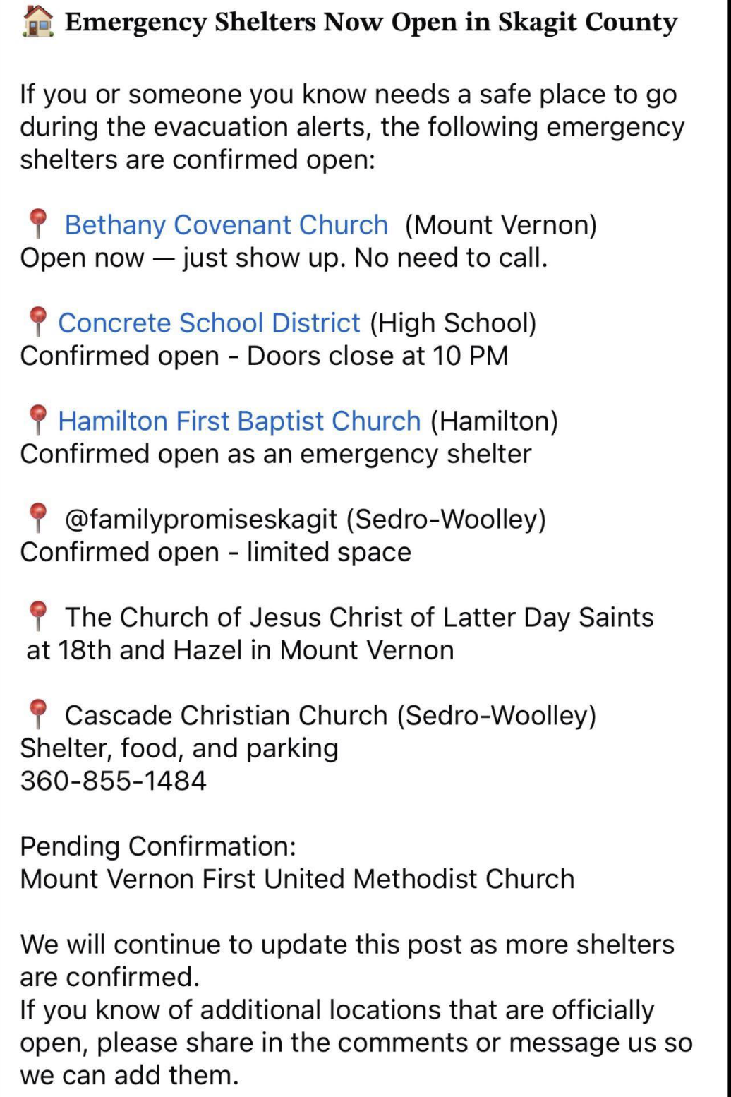 As conditions slowly improve, officials urge residents to exercise caution. Only return home if roads are open and your property is clear of floodwater. Many areas remain unsafe, and emergency crews are still actively responding. For shelter details and resources, visit: http://www.skagitcounty.net/flood.