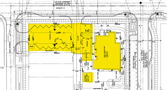 Separately from the conditional use permit process, Samish is collaborating with the City of Anacortes to fund improvements to D Ave, 15th Street, and 16th Street per the City's design, which will include 13 on-street perpendicular parking spaces and benefit both the new early learning center and the neighborhood. The street design overlaid with the new ELC site plan is shown below.